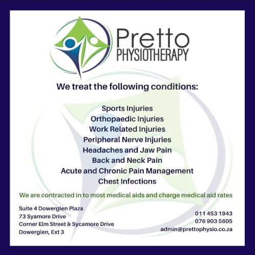 Pretto Physiotherapy is a sports and orthopaedic practice that is holistic, hands on and patient orientated where each treatment is tailored according to a patient’s specific presentation and needs. We aim to help our patients regain their optimal function, pain free by providing treatment and rehabilitation that is tailored to each individual case.